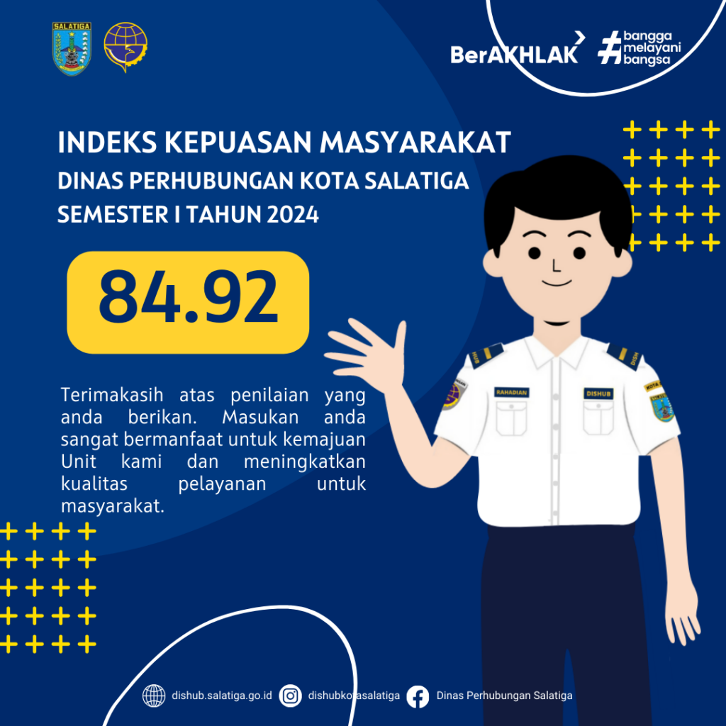 Indeks Kepuasan Masyarakat Dinas Perhubungan Kota Salatiga Semester I Tahun 2024, dengan nilai IKM 84.92. Terimakasih atas penilaian yang diberikan. Maukan tersebut sangat bermanfaat untuk kemajuan unit kami dan meningkatkan kualitas pelayanan untuk masyarakat.