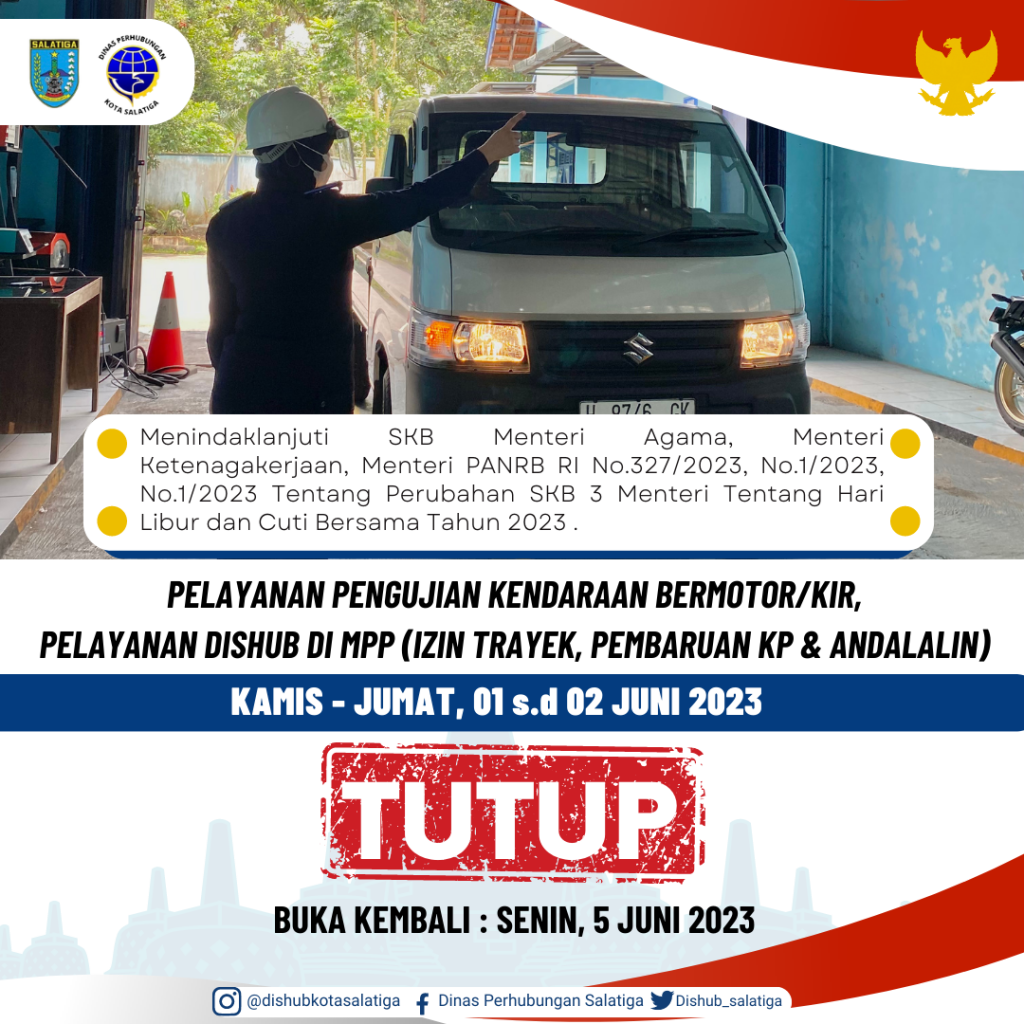 Maka dari itu, Pelayanan Pengujian Kendaraan/KIR di Dinas Perhubungan Kota Salatiga dan Pelayanan Dishub di MPP, TUTUP dan buka kembali tanggal 05 Juni 2023.