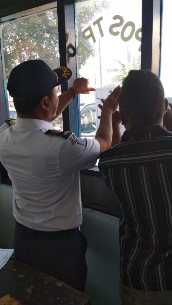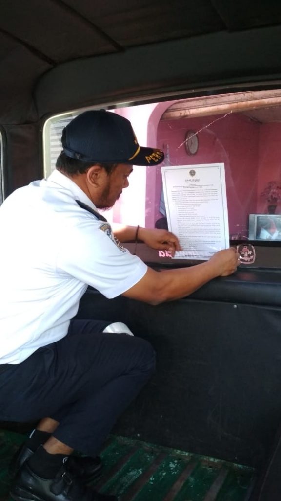 Personil dari Dishub juga memasang pamflet atau edaran yang berisi petunjuk teknis pencegahan penyebaran covid-19 di angkutan umum.